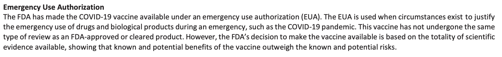 The Moderna COVID-19 Vaccine has not undergone the same type of review as an FDA- approved or cleared product.”
